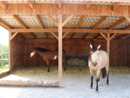 - Offenstall mit integrierten Futterständern